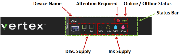 The Device Status Bar displays each autoloader device with which Vertex is configured to communicate, and the details for that device.