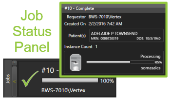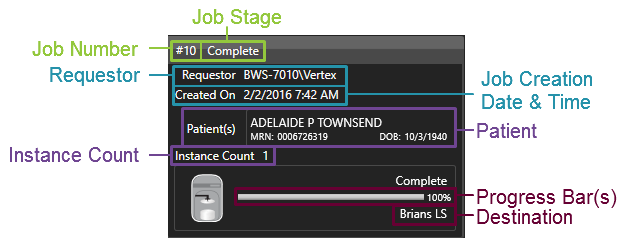 - Progress Bar(s): Indicating percent of job complete. A separate progress bar appears for each destination to which the job was submitted. The percentage of the progress bar(s)’s fill will change as the job is processed.